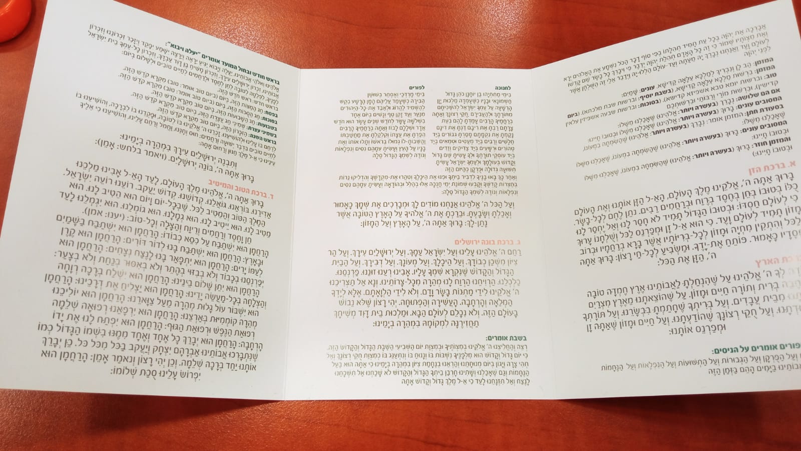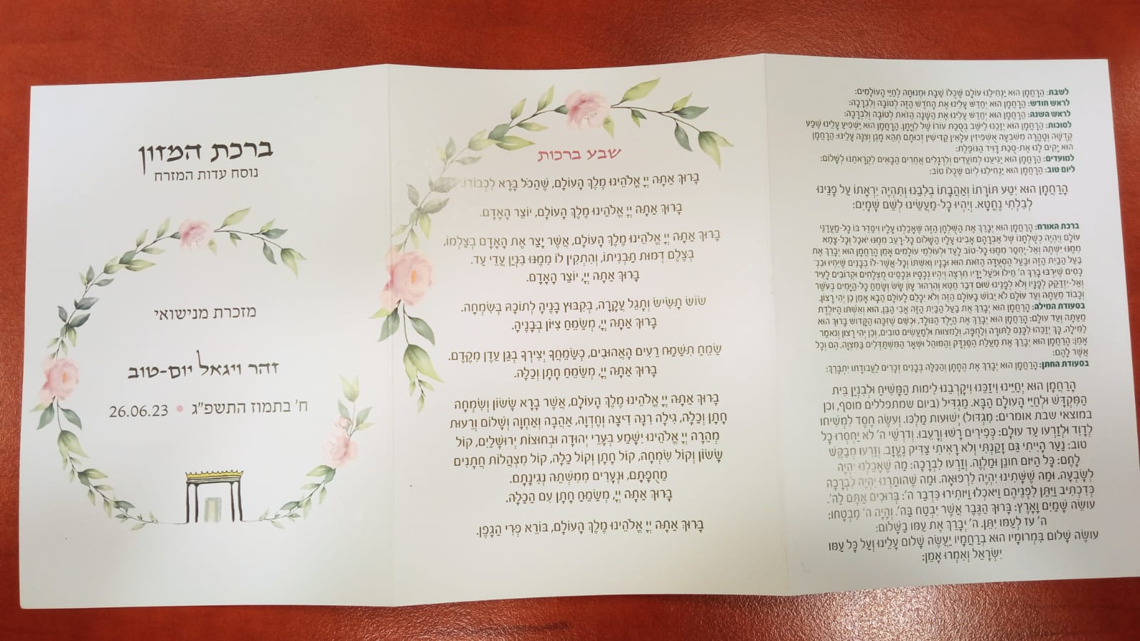 ברכת המזון מוצגת בהדפסה של ספרון מתקפל כאשר מאחורה מוצגים 7 הברכות.