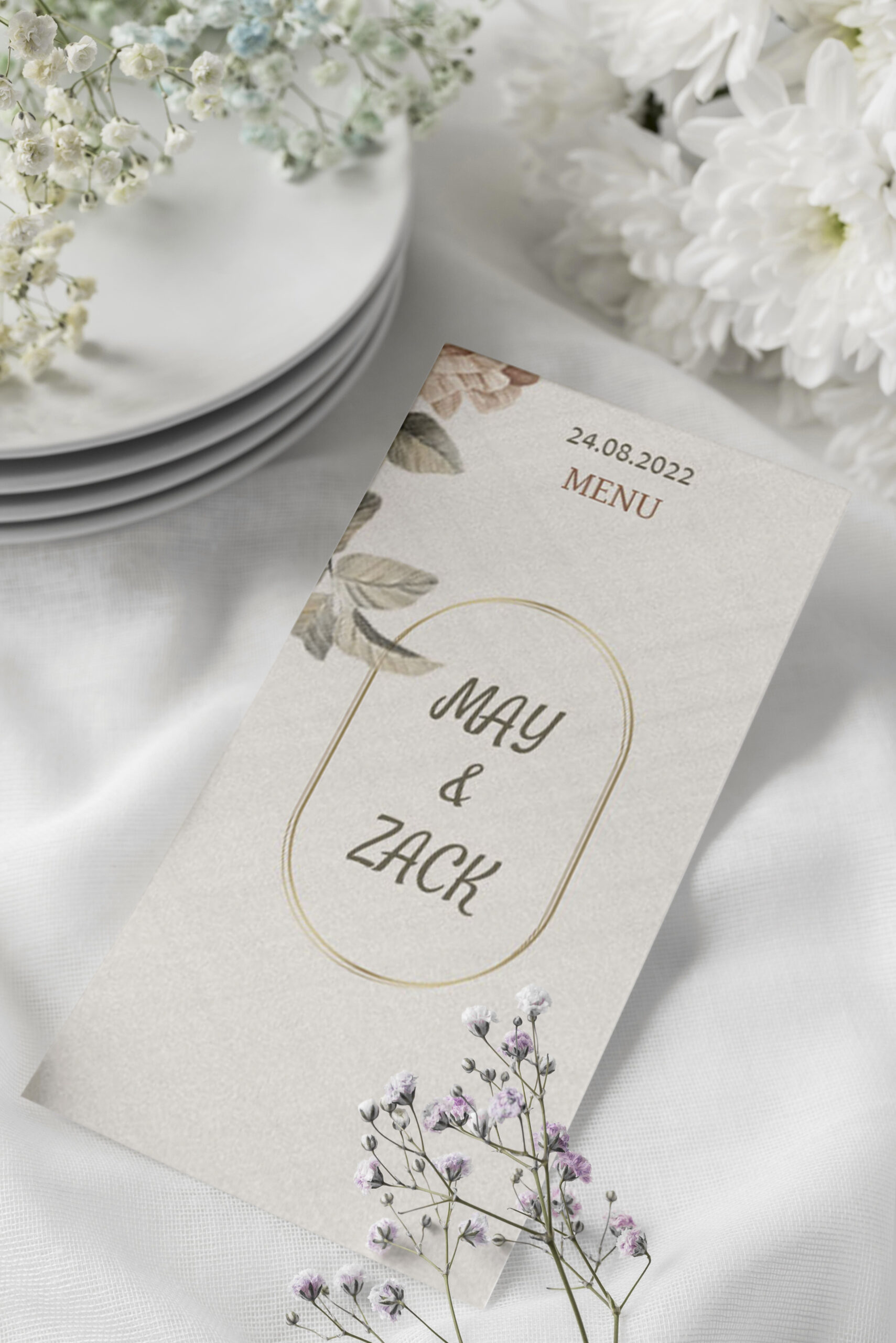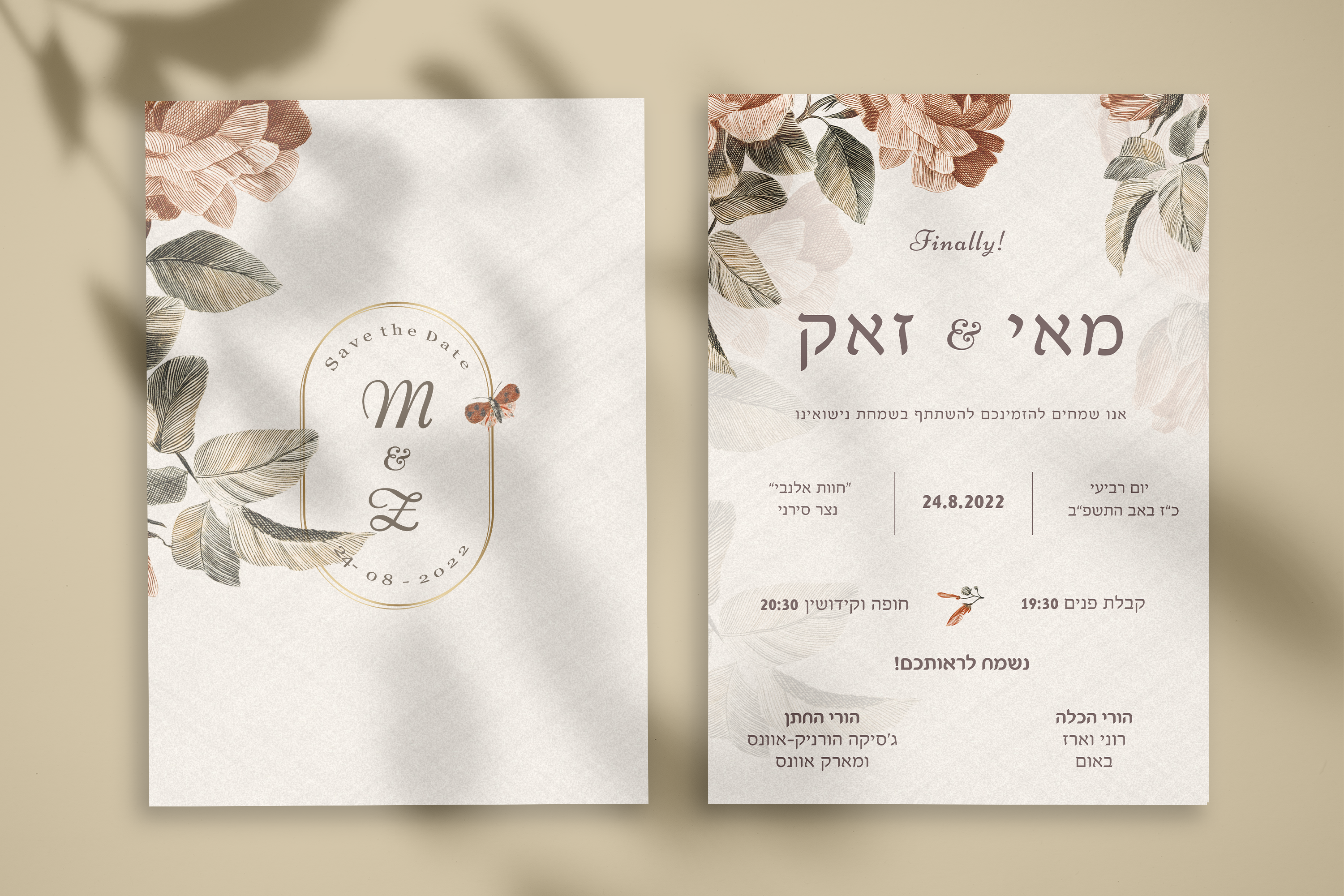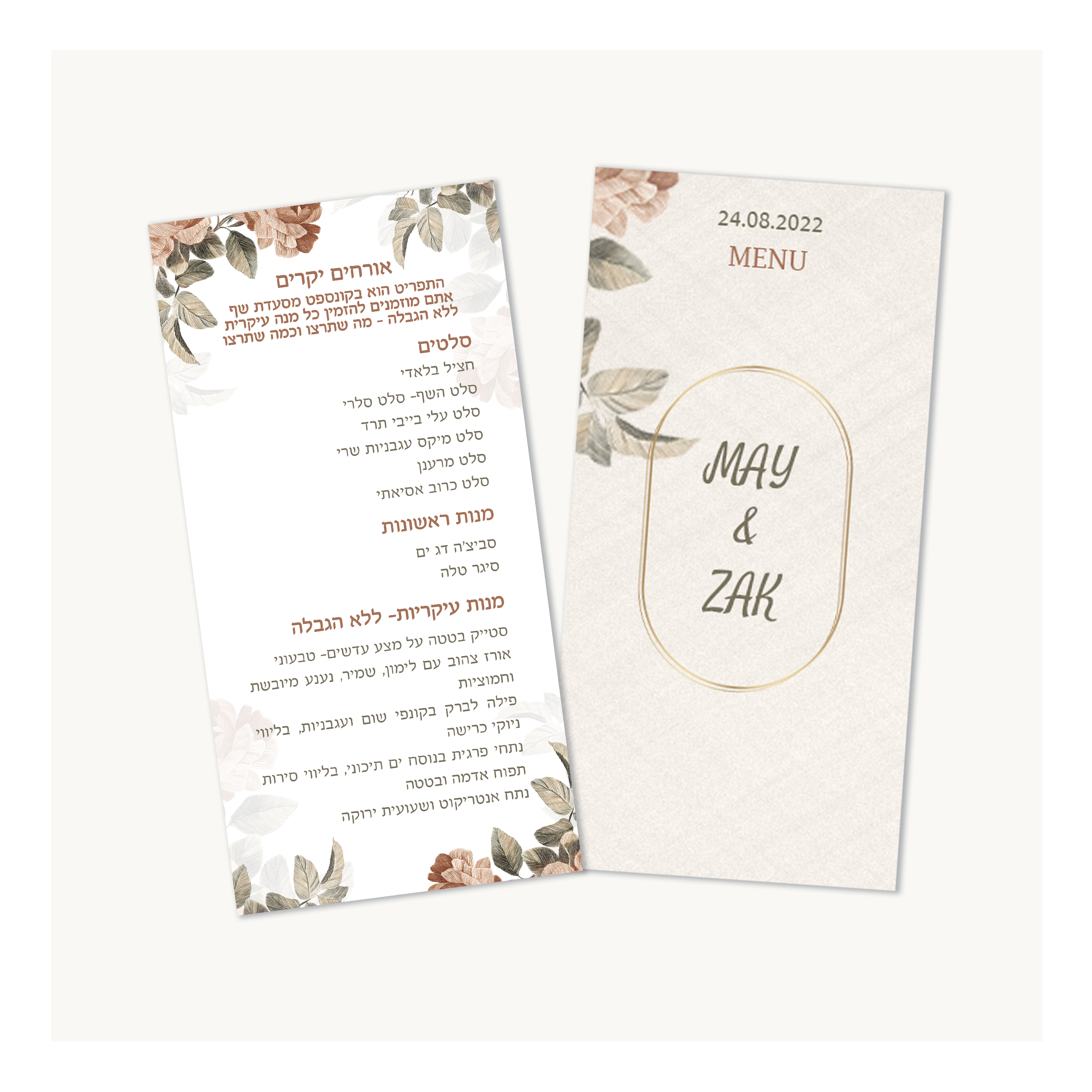 מיתוג לחתונה של מאי וזאק הכולל עיצוב הזמנה לחתונה, עיצוב תפריטים ועיצוב מגנטים, הכל באותו קונספט מהמם.